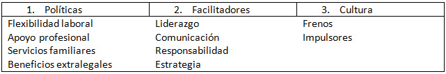 Este modelo permite a las empresas definir su situación en cuanto a políticas, prácitcas y cultura flexible y responsable. Consiste en retener el talento clave, flexibilidad laborar y apoyo a la familia.