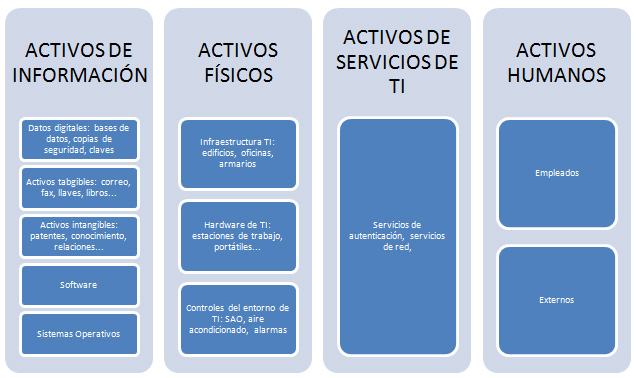 Activos de información bases de datos, documentación, manuales, software, hardware, contratos equipo de comunicaciones, servicios informáticos y de comunicaciones, utilidades generales como por ejemplo calefacción, iluminación, energía y aire acondicionado y las personas, que  son quienes generan, transmiten y destruyen información.