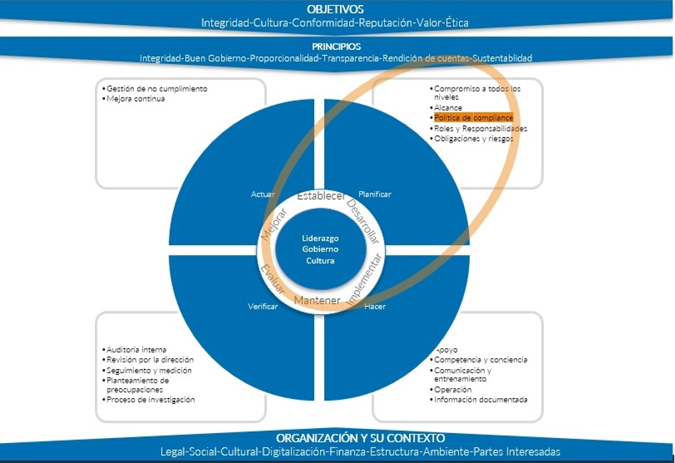 La política de compliance instrumenta el liderazgo en la organización y tiende puentes entre la cultura de la organización y su operación. En la Figura 2 se destaca la relación que tiene la política y el núcleo del modelo de compliance. Finalmente esta es la que instrumenta el liderazgo en la organización.